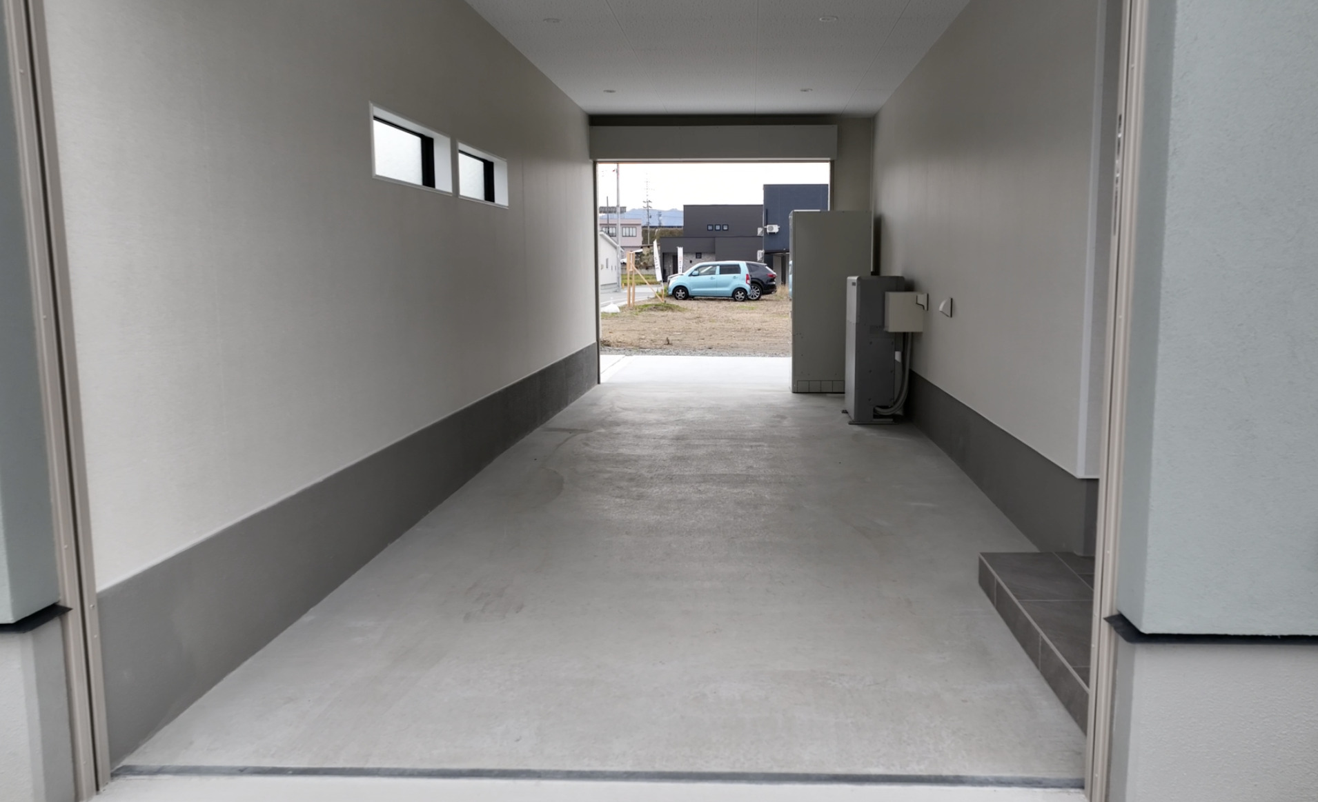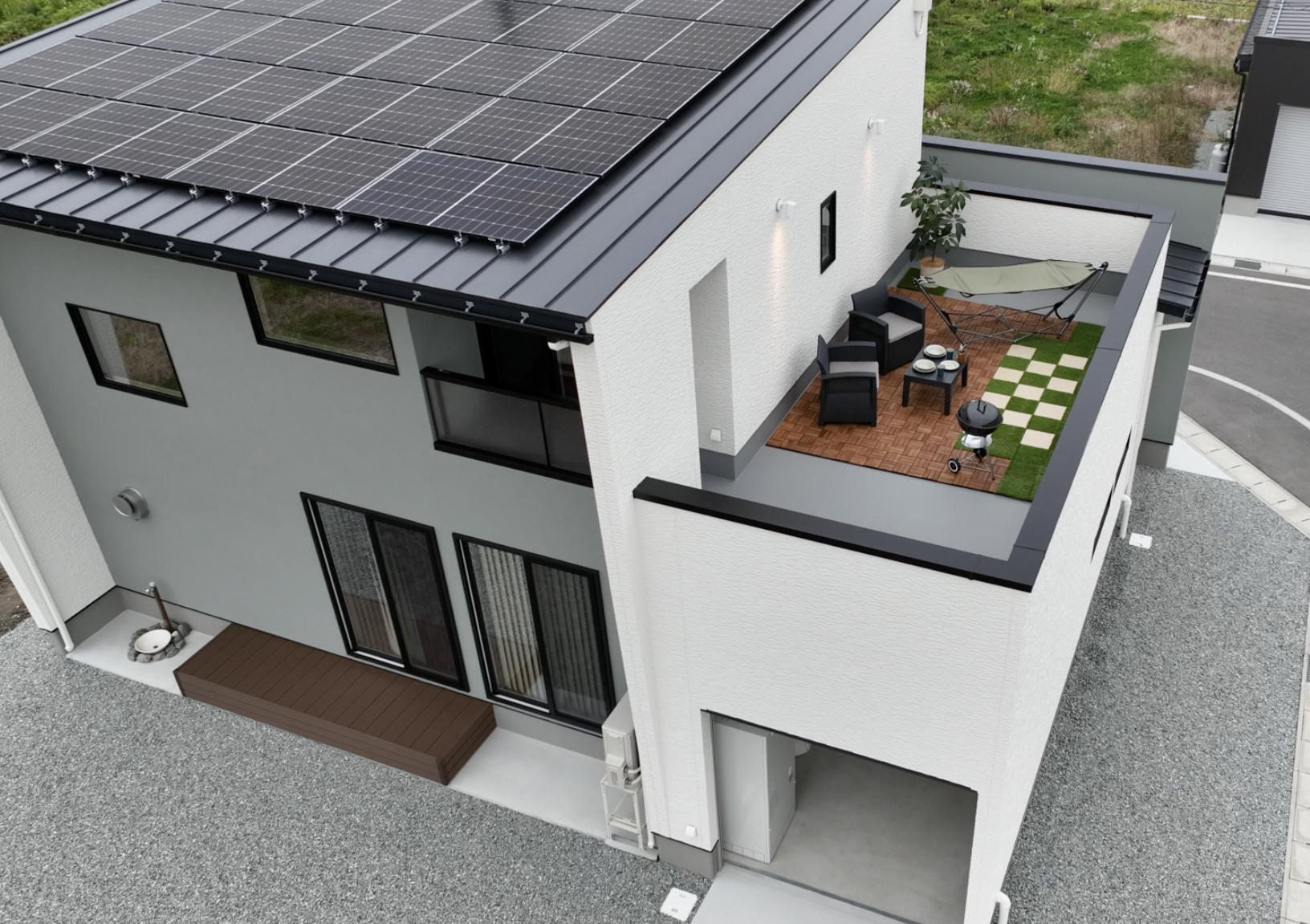 設備公営水道、公共下水道、ソーラーパネル、⼤容量蓄電池、エクリア(第一種換気、気圧調整式全熱交換気)、制振装置evoltz、システムキッチン、食洗乾燥機、ユニットバス、シャワー付洗面化粧台、エコキュート、インナーガレージ(電動シャッター)、樹脂サッシ複層ガラス等