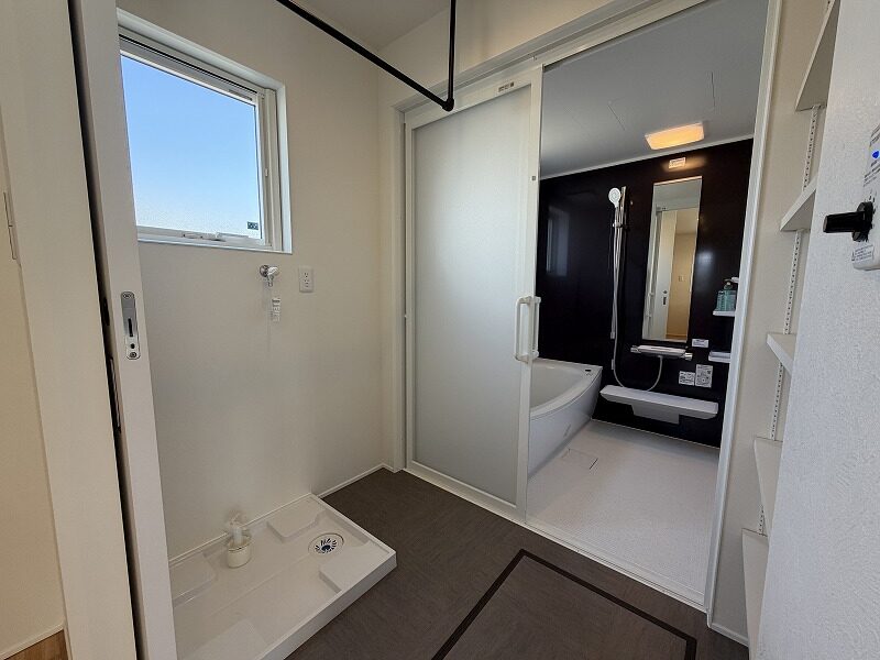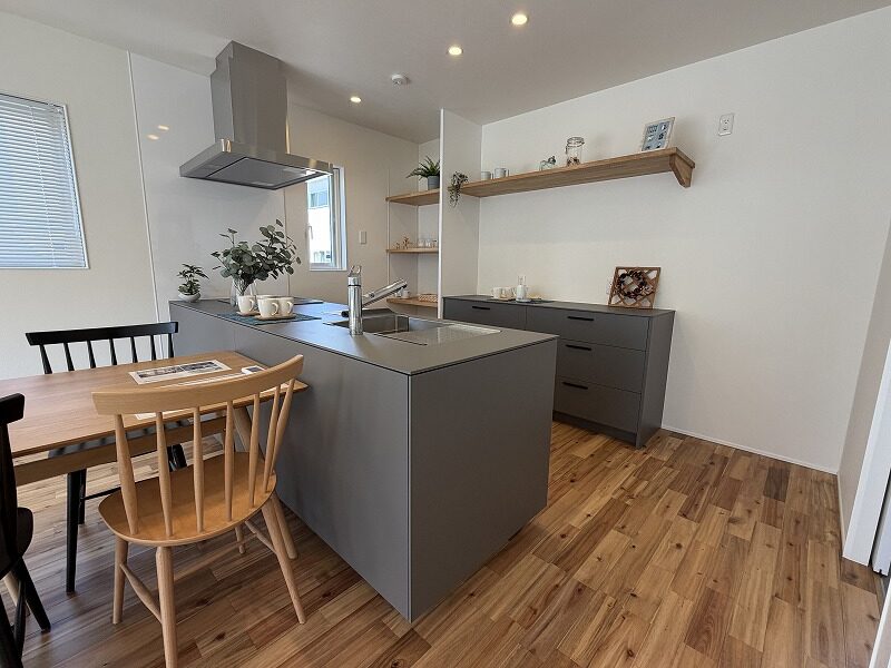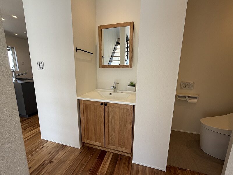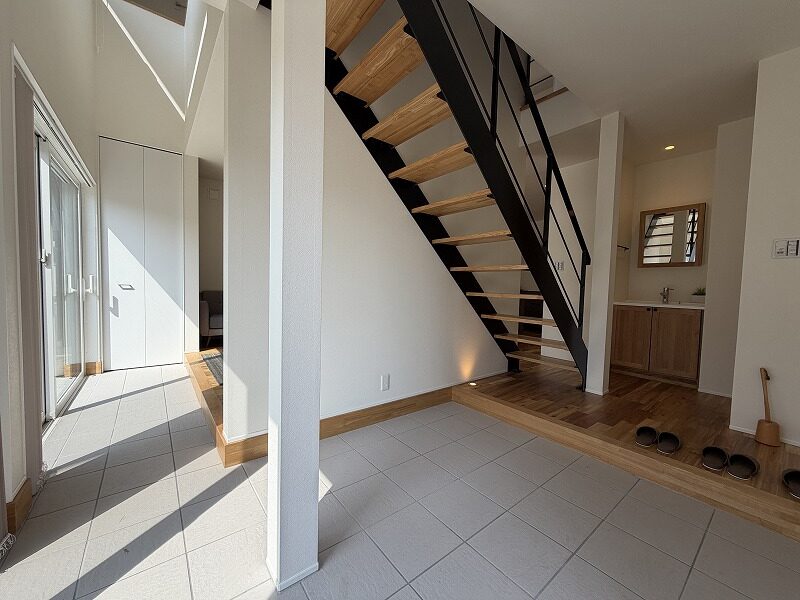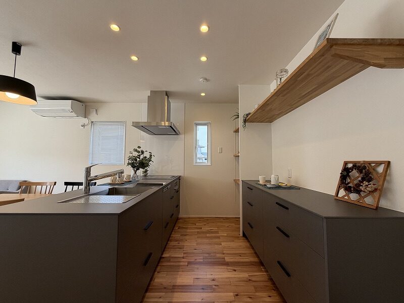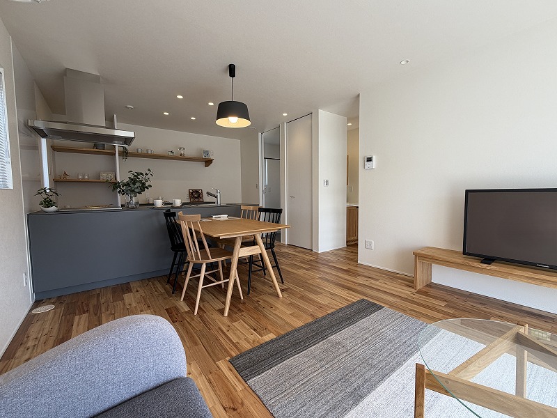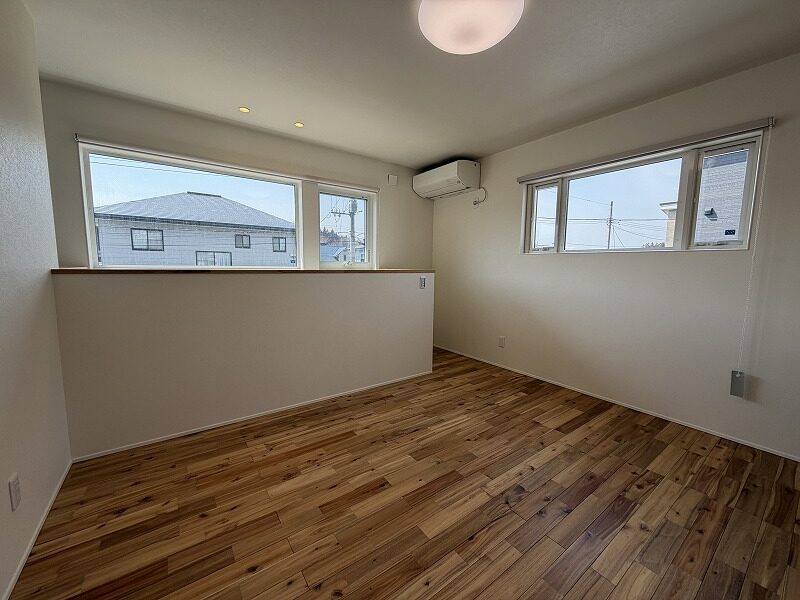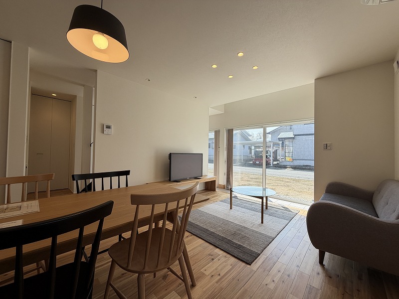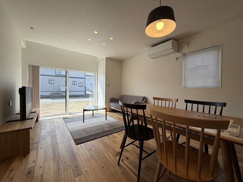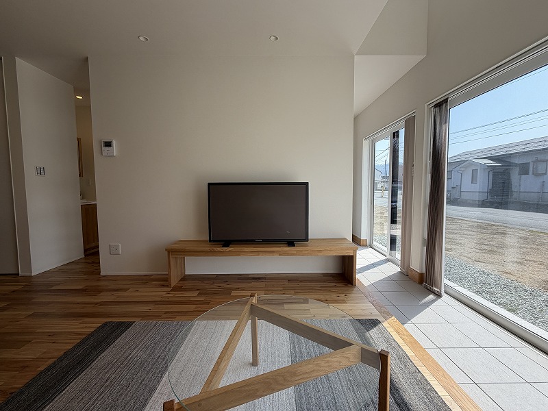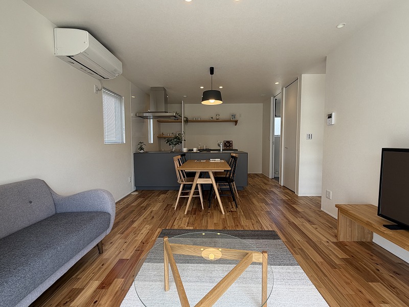 設備公営水道、公共下水道、システムキッチン、食洗乾燥機、ユニットバス、シャワー付洗面化粧台、オール電化、24時間換気システム、エアコン2台、照明器具、無垢床、複層ガラス、吹き抜け、室内物干し、家具付き等