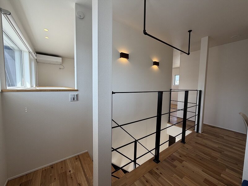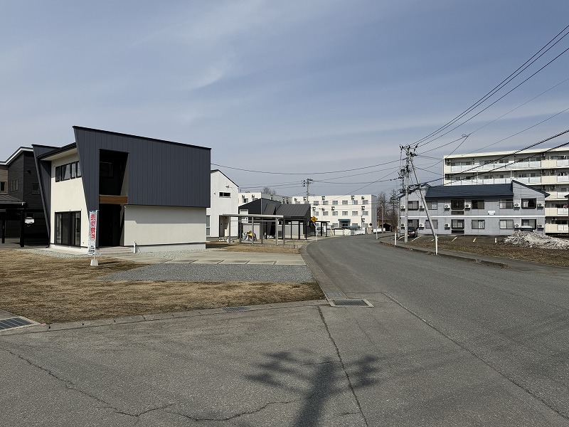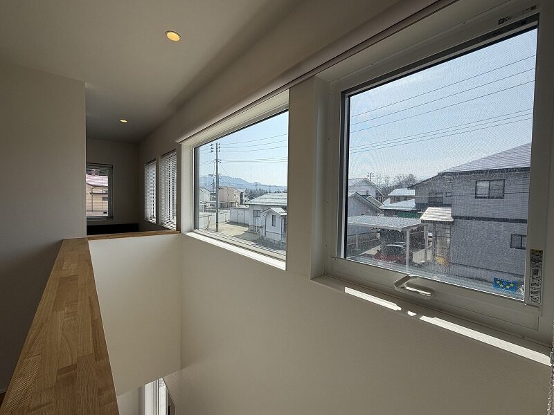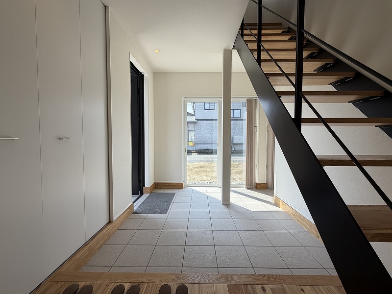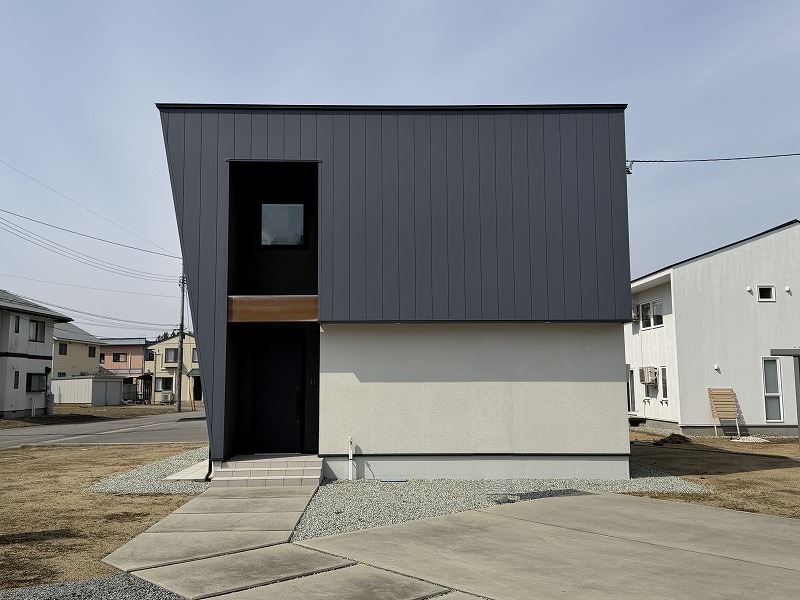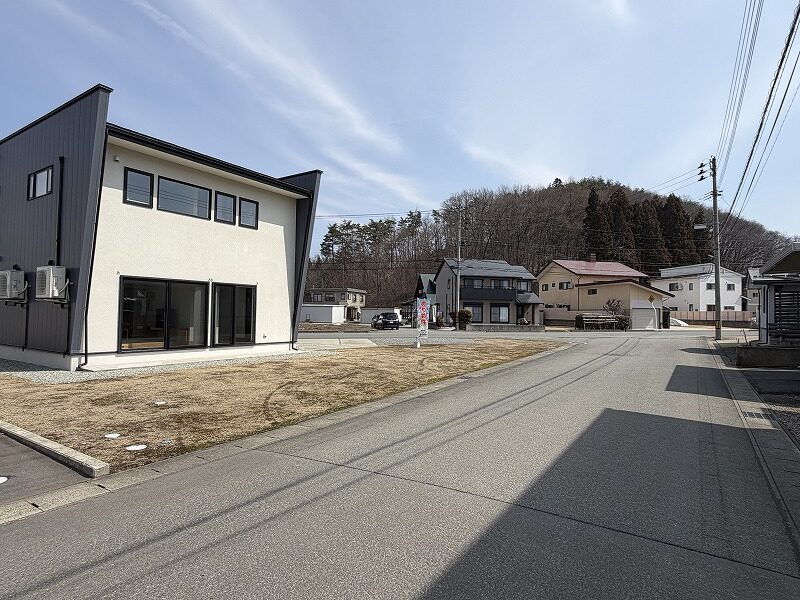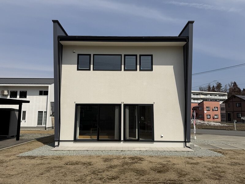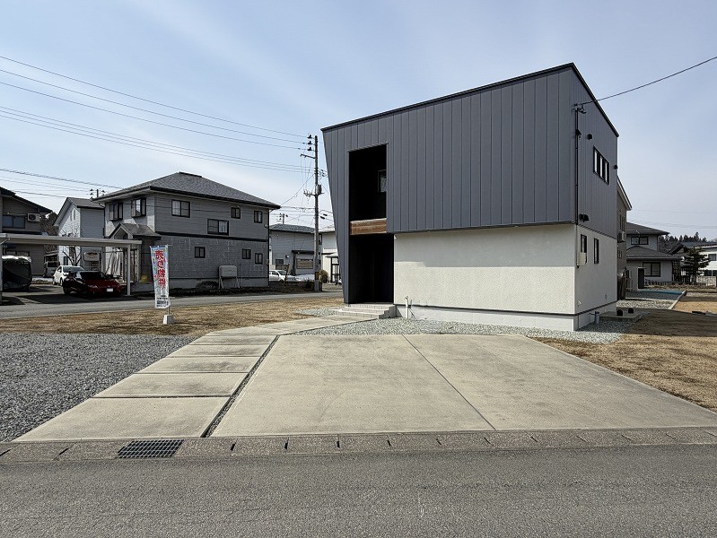 白を基調に、黒いガルバリウム外壁が映える印象的な外観。 アトリエ建築家によって設計された、デザイン性と暮らしやすさを兼ね備えた住まいです。 やまがた省エネ健康住宅の認証を受けた高気密・高断熱仕様で、季節を通して心地よくお過ごしいただけます。 玄関からリビングまで続く広い土間は、南面の大きな窓からたっぷりと光が差し込む明るく開放的な空間です。 土間・ホール・LDKが仕切りなくつながり、どこにいても空間の広がりを感じられます。 2階は2部屋(うち1室は間仕切ることで増室可能)とウォークインクローゼット。 ホールには造作のソファとカウンターが設けられており、読書やひとり時間を楽しめる、もうひとつの居場所となっています。 吹抜けやスケルトン階段など、空間に奥行きをもたらす設計も随所に。 細部にまで住まいとしての完成度の高さが感じられます。 立地は閑静な住宅地。落ち着いた環境でありながら、米沢駅やスーパー、国道・高速ICへのアクセスも良好です。 敷地や接道はゆとりがあり、冬場の車の出入りも安心です。