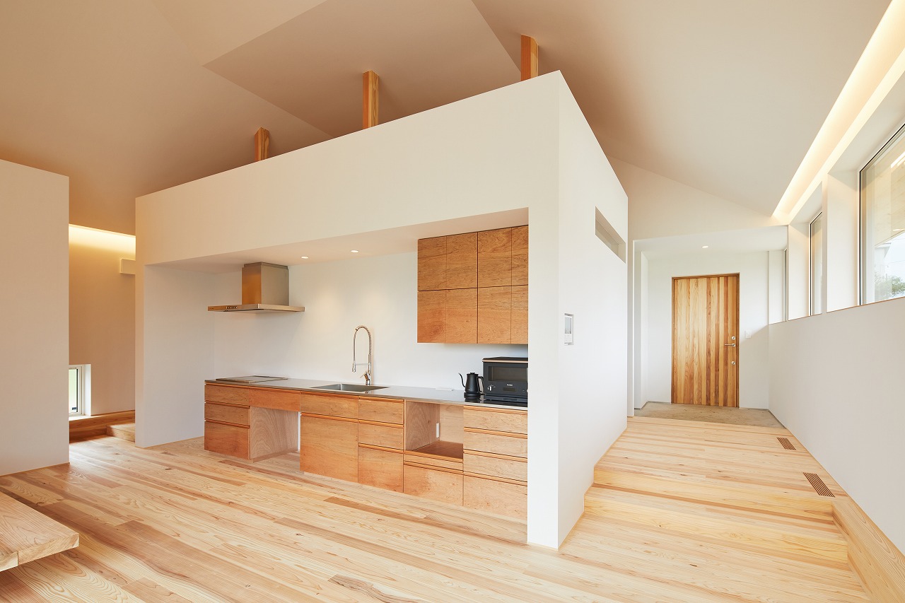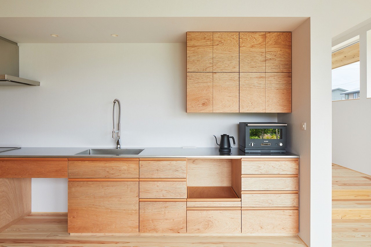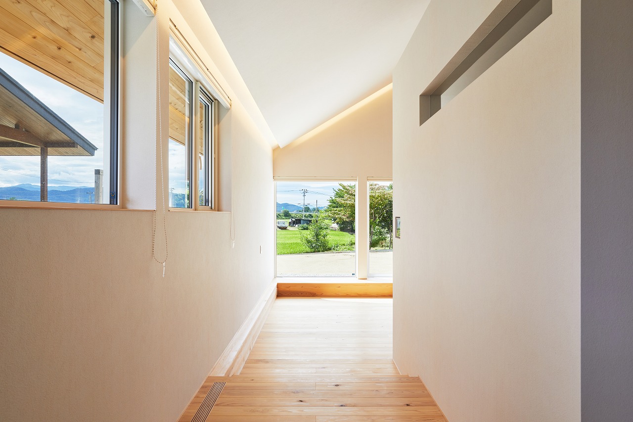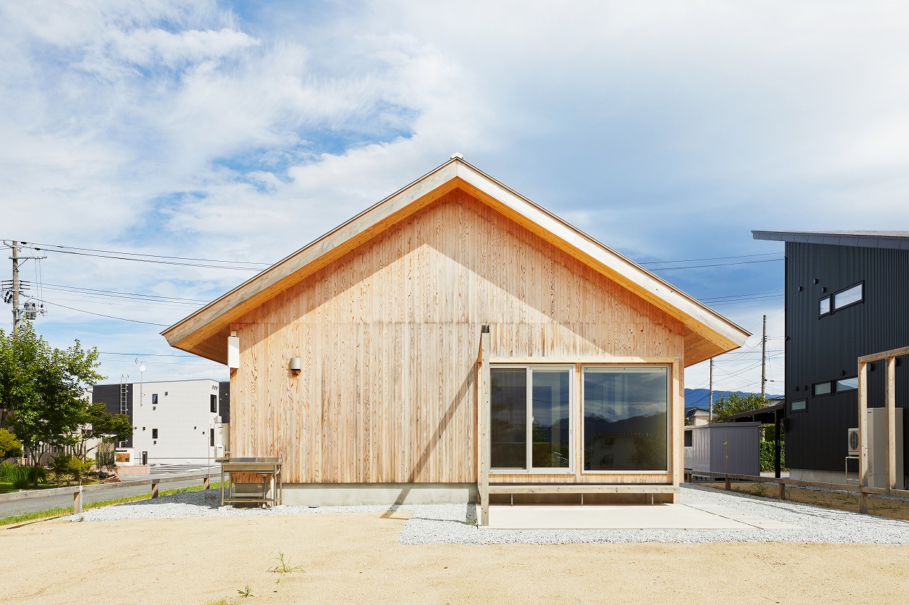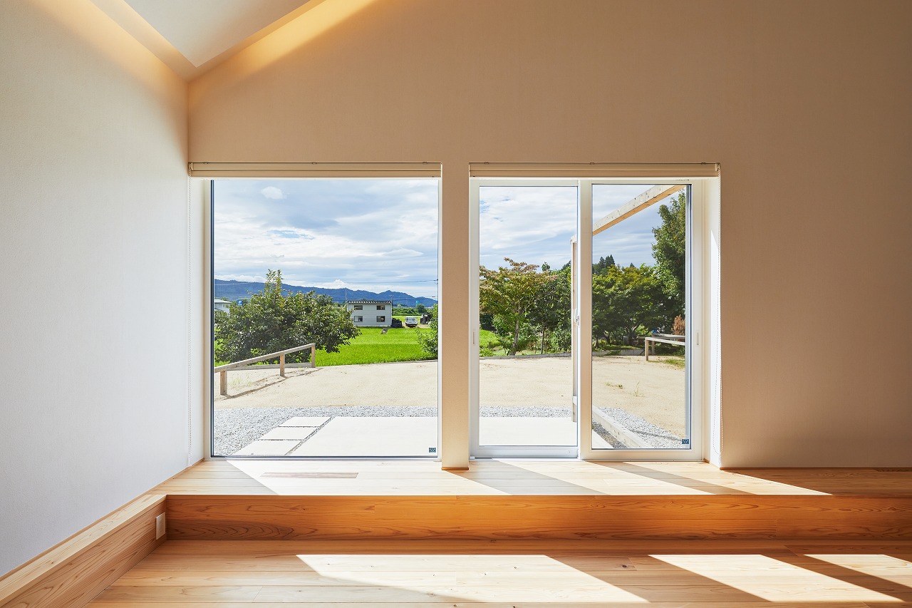 万世町桑山地内、188坪のゆとりある敷地に建つ平屋住宅です。 少人数での暮らしにちょうどよく、敷地の広さと建物のサイズ感のバランスが心地よい住まいです。 建物には米沢杉を使用し、天然木ならではのやわらかなぬくもりと木の香りに包まれます。 米沢の厳しい寒暖差にも対応した高気密・高断熱仕様で、光熱費を抑えながら一年を通して快適にお過ごしいただけます。 家の中心に向かって伸びる勾配天井と、仕切りのない回遊動線が、空間全体をゆるやかにつなげ、光と風を通します。 西に開けた立地を活かし、リビング西面に設けた大きな窓からは、庭越しに田んぼと山の風景が広がり、季節の移ろいを身近に感じられます。 窓際には造作のベンチもあり、景色を眺めながらゆったりと過ごせる居心地の良いリビングです。 造作キッチンや床下エアコン、寒冷地仕様のフル暖エアコンなど、設備面も充実。 全室カーテン付きなのも、すぐに新しい暮らしを始められるうれしいポイントです。